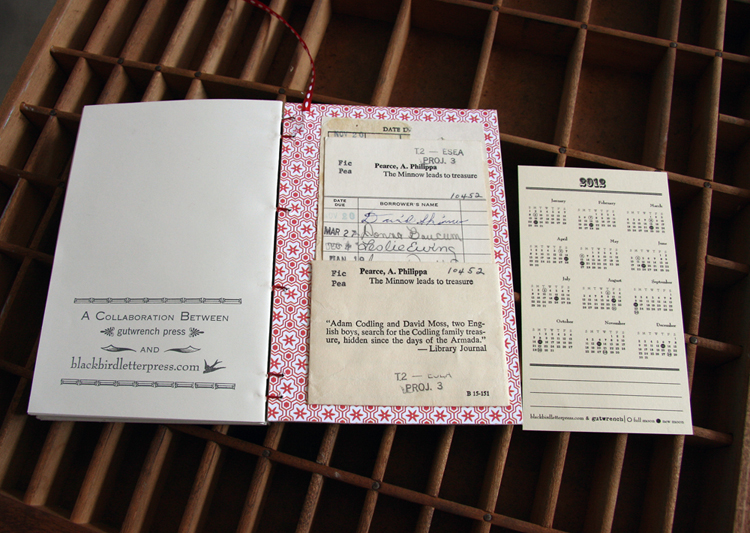 After printing nearly half the pages with hand set type and vintage printer cut images, we had plates made for the remainder of the pages. Still printed on the Vandercook, but now we could easily move the type (or in this case, plate on a base) off the press in order to print other jobs. Hundreds and hundreds of pages were printed, front and back. Does someone really need letterpress printed interior pages? Well, that's for you to decide. (printers cut images range from owls, typewriters, bulls, telephones, bikes, cats, boats, and more)